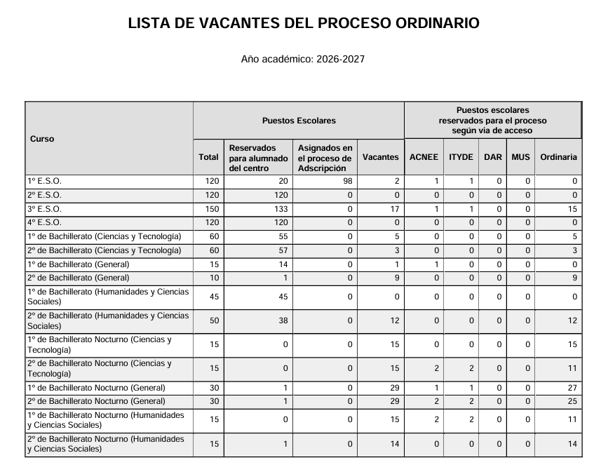 LISTA DE VACANTES DEL PROCESO ORDINARIO. CURSO 2026-2027 Escrito por M. De la Vega Vara Ganuza en 10 de abril de 2026. Publicado en Portada, Secretaría, Secretaría Actualidad. Enlace al documento completo: https://drive.google.com/file/d/1vOcuJYS77TrqzQyawCxYcuanegd02VEX/view?usp=sharing